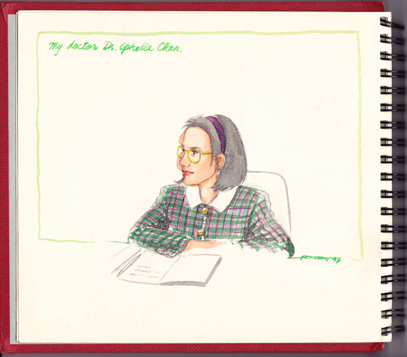 又數年後,我們結婚了,妳初懷身孕。每次我陪伴妳到婦科診所檢查時,那位婦科女醫生都詳細地告訴我們,有關懷孕期要注意的事情。妳低下頭抄寫著要點,我卻拿出畫簿繪畫她的樣子。後來我回家塗上水彩,並做了一個覆印照片,在妳最後一次婦科檢查時送給她留念。她看見自己的畫像時,笑得像少女般甜美,不像一位嚴肅的大國手。那天我們見識了專業人士背後的溫柔。
