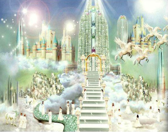 (三)天國全景 這是天國全景。沿著白色的階梯往上走,會進入一個城,在那裏能向父神和主耶穌獻上榮耀,幷與祂們一同喜悅歡樂。 我看到以鑽石形成的發光山嶺,也能看到身穿白衣的天國靈魂的人們的樣式。天上飛翔的白馬載著天國的靈魂們,在世人無法想像的廣闊天國各處馳騁。 天國是一切喜悅和幸福永遠延續的地方,是按照人在世上所累積的愛以及義行來建立其住處的地方。越靠近父神和聖子耶穌所在之處的地方,越發出燦爛美麗的天國之光,而且越完全的靈魂能居住在越美麗的天國區域。