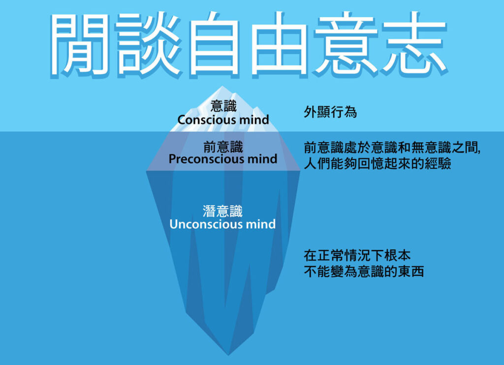 學者認為有些情況,我們的行為不一定是由主觀意志決定。心理學家弗洛伊德提出意識層次論(或稱為冰山理論),將意識劃分為三個層次:意識、前意識和無意識。意識是人對環境及自我的認知能力,有意識的行為是人有自決行為的能力。前意識指人能夠回憶過去的經驗,而潛意識是指內心深處被壓抑,卻無從意識到的欲望。人的意識組成就像一座冰山,水面上只露出一小部分(意識),但是隱藏在水底下的龐大部分(前意識和無意識),卻對我們的行為有極大的影響。