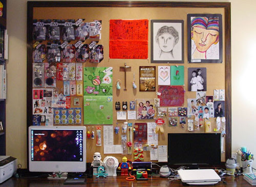 為何要訂製這麼大的一塊壁報板呢?說來話長,我和内子都是從事設計行業,我們習慣把重要的文件、圖片、行事曆和小玩意貼在當眼處。當我們搬進這間房屋的時候,把玄關旁的小客廳改造成工作間,我們特別為這個空間訂製工作桌和配合整幅牆大小的書架,更在工作桌前的牆壁,安裝這塊壁報板,然後我們把喜歡的東西都貼上去。從此孩子的畫作,也有了好歸宿。