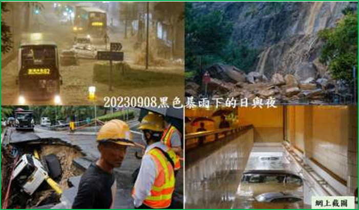 2023 年 9 月 8 日,香港又碰上百年一遇的暴雨,其實周四晚上 11 時天文台已發出「黑色暴雨」警告,在隨後一小時內,竟然錄得 158 毫米雨量,是 1884 年天文台有紀錄以來的最高雨量。更甚是「黑色暴雨」警告連續懸掛了 16 小時,全港處處變成澤國,不少山坡倒塌的事件發生。最恐怖是「黃大仚地鐵站」嚴重水浸,雨水竟然灌滿地鐵站並溢出地面,當時學生們連續兩個星期五都不能回到學校,要留在家中。哎呀!「不尋常的九月天」要考驗政府處理災情的策略和措施!