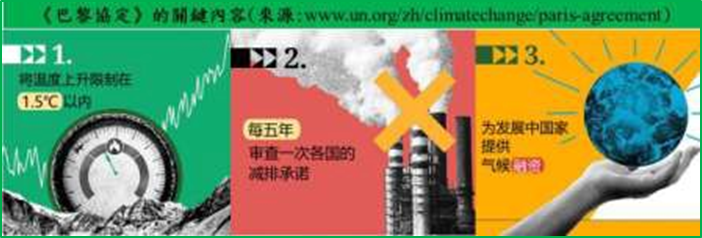 國際社會其實早已有共識,溫室氣體的排放量如脫韁之馬,必須壓制。為應對氣候變化,在 2015 年 12 月巴黎召開的締結方(有 197 個國家參加)會議上通過了《巴黎協定》,協定於 2016年 12 月生效,主旨是要大幅減少全球溫室氣體排放,將本世紀全球氣溫限制在攝氏 2 度之內,同時尋求將氣溫升幅進一步限制在攝氏 1.5 度以內的措施。協定以圖中三大目標為旗幟,讓各國因應國情和國力訂定策略和法規,以回應保護地球的普世訴求,訂定「碳中和」(即是確立二氧化碳零排放的日期)的日程,西歐國家將達至「碳中和」的日期訂為 2050 年,而中國則把日期訂為 2060年。