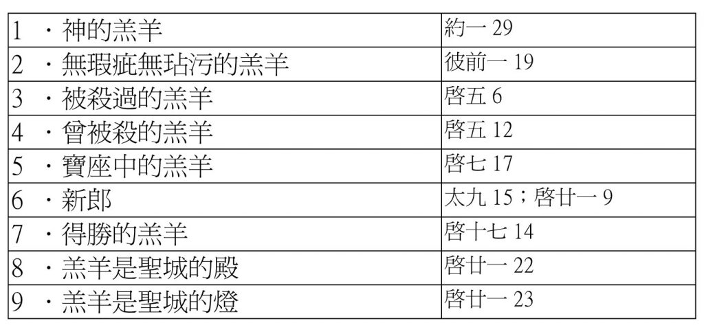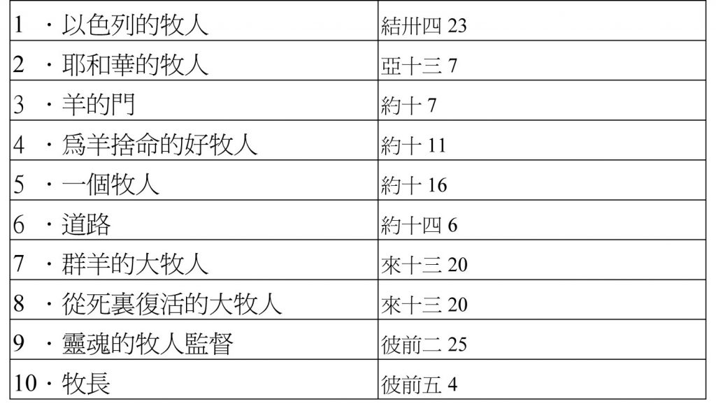 蘇佐揚 七.神哪!我來了,照「你的旨意」行(來十9) 八.神賜祂超乎萬名以上的「名」(腓二 9~10) 九.曾被殺的「羔羊」、是配得權柄、豐富、智慧、能力、尊貴、榮耀、頌讚的(啟五 12) 十.神必立一牧人照管他們,牧養他們(結卅四 23)
