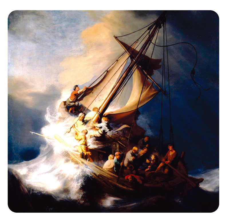 〈苦海風浪〉這幅著名的油畫是荷蘭名畫家 Remebrandt(1600-1669)在 1633 年(當年他 29 歲)所畫的,圖中所見,船在海中猛力搖晃,當時風勢甚大,船的四周充滿驚濤駭浪。船上共有 13 人,四人在船頭,一人竭力固定帆,一人在船邊嘔吐,其他人不斷努力,希望可以協力將船上的水潑向海中。此畫家本人經常把自己畫在畫中,而在!苦海風浪〉裡,在船邊面向觀眾的就是 Rembrandt 本人。