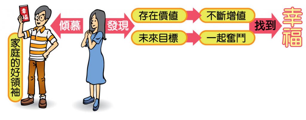 英明的領袖讓人傾慕追隨,因為他有見地、有方向、有誠信。男人正是家庭的領袖,丈夫愛惜家庭的決心,激發配偶發現自己的價值,同時推動她為了家庭而不斷增值。更重要是,一個愛護妻子的丈夫,能開啟妻子的眼界,讓她看到未來一片美好的國度。於是,妻子便無須畏懼任何生活困苦;相反,幸福的憧憬讓她樂於與丈夫一起奮鬥。