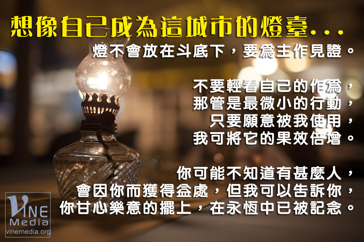 天父爸爸: 我願意、我願意被祢來使用,成為發光、發熱的燈台,是要放在明處、高處的。縱然我看自己是多麼的微小、多麼的不起眼,但祢的話說:「人若有願作的心,必蒙悅納,乃是照他所有的,並不是照他所無的。」故此,我要隨時預備好自己,當祢的時間一到,我就能立即地回應呼召!謝謝祢揀選我、給予我機會!我奉主耶穌基督的名祝福我自己,能夠在小事上忠心、忍耐,成為主所稱讚,是良善、又忠心的僕人!阿們。