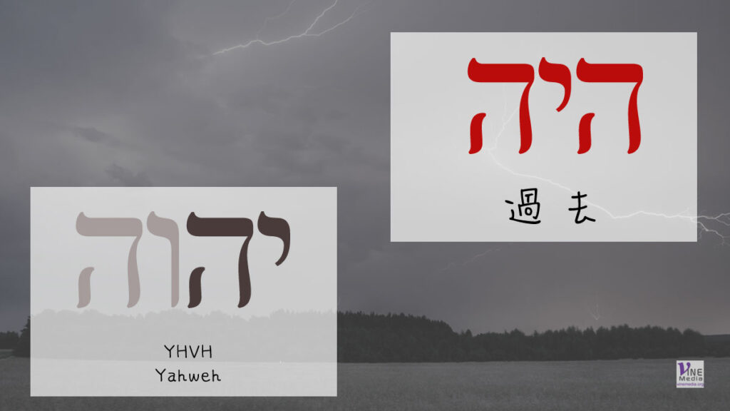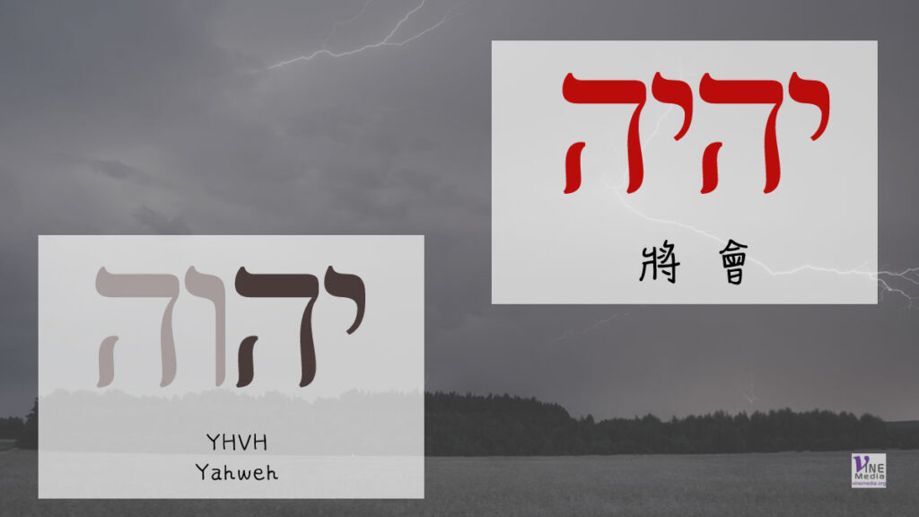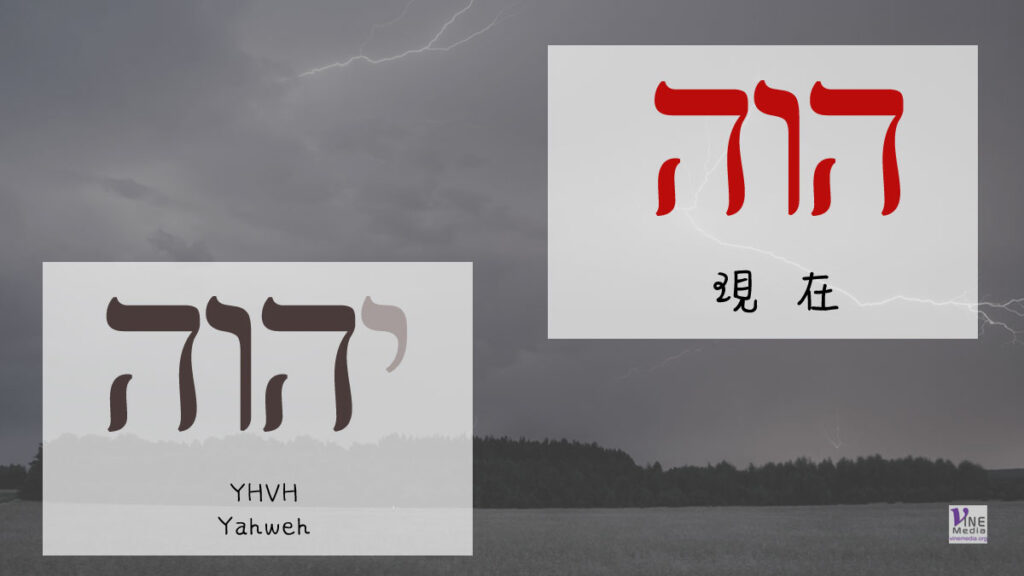 神回答摩西:「我是自有永有的」。神的名在希伯來的原文是 יהוה (YHVH),從以下的字所構成: