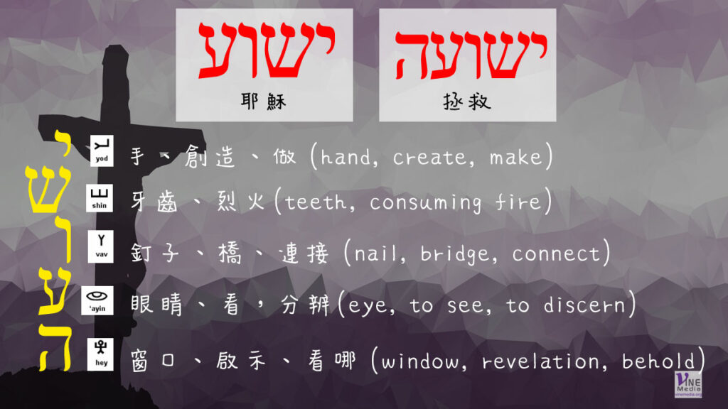 單從耶穌的希伯來名字來看,耶穌 ישוע (Yeh-SHOO-ah),這字的字根是 יָשַׁע (yasha),意思是「釋放、拯救、救主和救贖」。