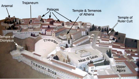 別迦摩的原名是「高處」或「高度」,也可以翻成「結婚」或「連結」的意思,也是代表山上面的堡壘,代表它很有能力或很有寶藏的意思,這個是以前的歷史學家推敲編出來的,它是建立在一個離地300公尺高的平原,它裏面有很多的設備。我們看下一張: