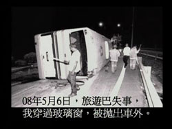 但要由學校坐七個小時的車程才到機場。但坐到四至五個小時的時候,郤發生了一個交通意外。車子在沒有超速的情況下翻倒了,這是一部冷氣巴士。我和另外一位弟兄穿過玻璃窗被抛出車外,由於被抛出車外的緣故,所以傷勢特別嚴重,而那位弟兄大約一小時後便離開了我們。我當時躺在地上怎樣呢?我當時在那大約等了一個小時,車程大約又花了一個小時,總之來來回回好一段時間後,才能做手術。我當時一摔倒的時候,我的心就在想:要不要生神的氣呢?我很乖我來是做義工,我一向很聽神的說話,為何會發生這樣的事?所以我心裡面就出現這句話:我要不要生神的氣呢?在那一刻我在想,在人的眼中我是一個很積極的人,不過我知道我那積極樂觀的思想,不能在這大事上幫到自己,所以在那一刻我做了一個佷重要的決定,我跟神說:「我決定跟隨祢!我決定繼續跟隨祢!求祢告訴我,我接著要做些什麼?」在那一刻,那怕事怕痛的我,發現內心很平靜,基本上在整個的過程中我都很平靜… 但我當時傷得很嚴重… 我且形容一下我當時傷得有多嚴重… 我摔倒在地上,大家看到我當時是長頭髮而且有一些卷曲,我頭皮嚴重撕裂,從這裡到這裡要縫四十多針,這裡有一個很深的傷口,頭後面都有一些地方需都要縫針的。我頸椎移位了,險些癱瘓,眼睛變紅了,因為微絲血管爆了也腫了,臉也腫起來。我以前為我的牙齒長得很整齊而感到自豪,但卻崩了很多顆牙齒,連嘴巴也張不開,連一個茶匙的位置都張不開,整個臉都破損了。當我摔下去的時候,雖然看不到自己的樣貌,但那一刻我斷定一件事──我已經毁容了!所以在那一刻我是抱著這樣的心事來等待著醫治的。