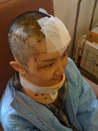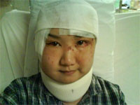 剛才看到的臉部比較廋,但手術做完之後卻變成了立筆小新(卡通人物),看不見下顎… 因為打了麻醉藥就會變成這個樣子。做完手術之後我才知道做了些什麼手術。第一是幫我清理那些玻璃碎、第二是醫生發現一星期前的縫針已癒合,要麻醉拆線、第三個是我的前額做了些消毒和處理的工作… 每天都要消毒,好叫我能在最佳狀態下做手術,由於這部份還未處理好,所以未能做手術。