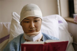 這事被刊豋在報上… 在內蒙古的時候… 到了醫院時已是幾個小時之時的事了。血、玻璃碎、泥沙、頭髮全部都混在一齊,在麻醉時我的感覺是… 不知道醫護人員有否為我做麻醉,因為我能完全感受到他們對我所做的每一件事,例如:他是怎樣的麻醉呢?平常理應用一些棉花點一些消毒藥水後再搓一搓,他們乃是把消毒藥水直接倒下來… 我能感覺到他們在那裏替我搓傷口,因為他們要搓脫那些泥巴,我感到很痛,真是很痛!那痛楚是無法形容的。我躺在那手術床上覺得很冷,可能是失血過多,因此一點也感受不到任何的溫暖!在那時候我在想… 我跟神說:假使剛剛被拋出車外的時候就死了,我便毋須忍受這痛苦… 但在我裡頭有一個聲音響起… 假若我死了我的父母怎麼辦呢?他們要怎樣來內蒙古接我的遺體回港?我怕他們支持不了,就馬上想,還是不要好了,只好繼續忍受。接著做手術要縫四十多針,我再說,我真的感覺不到有任何麻醉的果效,所以我很真實感受到縫針時候的針起針落的感覺… 很痛、很痛… 一痛我又想… 我聽到門外弟兄姊妹的聲音,我就問說:為何是我?為何會那麼的嚴重?我不被拋出車外便不會那麼嚴重… 但在那一刻裡面有一個聲音對我說:「若不是你,你會想是那一個呢?」我想了想… 誰也不想… 算了吧!反正我正在做手術… 醫護人員繼續替我處理,沒多久又覺得很痛… 將來我打算結婚,婚後想有小朋友,別人說生孩子是十級痛楚,還有別的比現在更痛嗎?真是很痛很痛… 但不知道如何我便熬過了這個手術的過程。