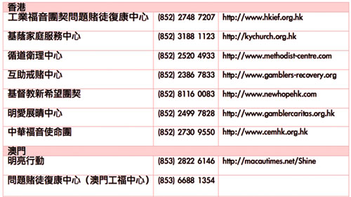 如果你或你的家人朋友,正面對賭博的問題,歡迎你聯絡在香港及澳門的這些福音戒賭的機構: