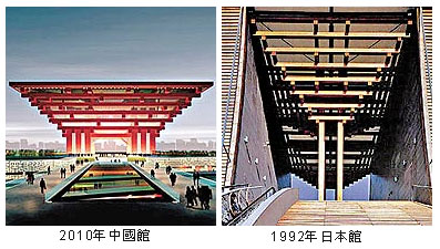 被稱為「東方之冠」的中國館,亦被指是山寨貨。外形如同日本鳥居、由正方形木構架建築的中國館,與 1992年世博會中的日本館極其相似,當年的日本館,是出自日本建築大師安藤忠雄的手筆。對於中國館抄襲一事,世博當局亦沒回應。
