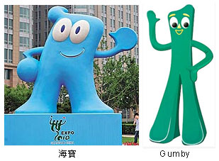 巫永堅和邵隆設計的世博吉祥物「海寶」,其主體形象類似於漢字「人」,以示人是城市的核心,被指與上世紀 50年代在美國誕生的著名卡通人物 Gumby相似
