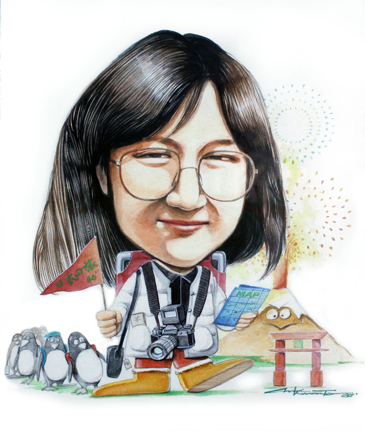 性格率直的她,常常遇上獨特的經歷。她從京都回來後,我繪畫了這幅漫畫,紀念這位義務領隊的奇遇。