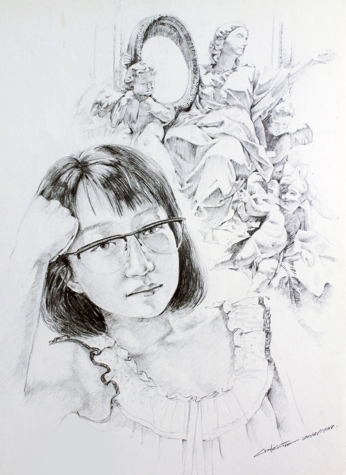 這幅速寫是她睡前沉思的樣子,背景配上聖彼得大教堂內的雕像。我和她曾到訪意大利聖彼得大教堂,看過由彼得羅·布拉奇(Pietro Bracci, 1700-1773)的雕塑(Monument to Maria Clementina, 1742) ,他以巴洛克晚期的風格,從冰冷的雲石勾劃出極緻溫柔的形態,這種難以形容的溫柔,與我愛的她相襯。