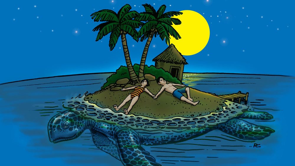 晚上月光灑在我們的身上,泛起淡淡幽怨的藍光;小海龜努力地爬向無邊際的海洋,我們卻依依不捨地躺在暖和的沙灘上不願離去。
