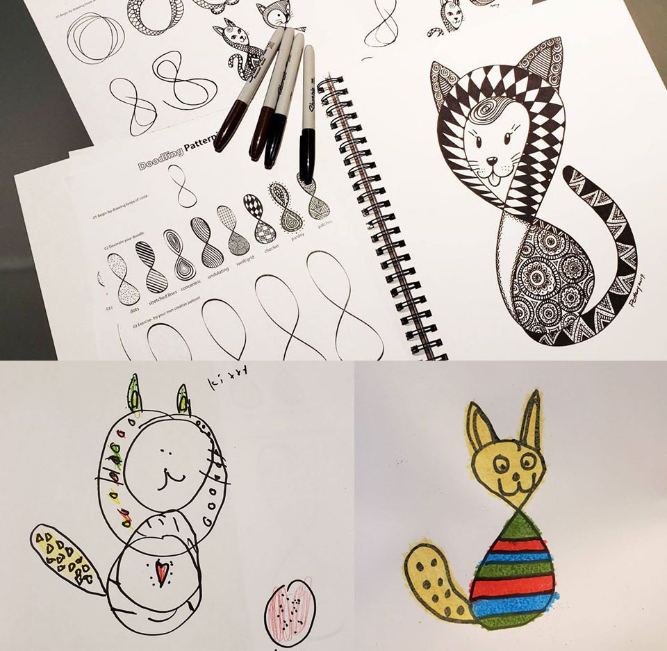 第一課,為了引起這些青人作畫的興趣,我用粗黑油筆在白板上隨意畫了個”8″字,我叫他們猜猜這個圖案是甚麼動物,大家都產生好奇,專注我的示範。然後我在圖案上方加了三角形的耳朵,有位青年立即聯想到花貓;於是我加上面部細節,很快便出現一頭花貓造型。我連忙稱讚那青年的聰敏,更鼓勵他們在紙上嘗試繪畫。他們依樣葫蘆,用粗黑線筆繪畫造型;然後義工和他們一起用木顏色塗上色彩。他們的構圖各有特色,有人畫的貓兒很小,可能他較為害羞,不善於表達;有人畫方形面相的貓,看來他的性格相當硬朗;從畫中也可窺看作畫人的性格哩!