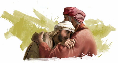 「兒子說:『父親!我得罪了天,又得罪了你;從今以後,我不配稱為你的兒子。』父親卻吩咐僕人說:『把那上好的袍子快拿出來給他穿;把戒指戴在他指頭上;把鞋穿在他腳上;把那肥牛犢牽來宰了,我們可以吃喝快樂;因為我這個兒子是死而復活,失而又得的。』他們就快樂起來。」