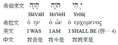 假如耶和華一名、真是如此構成的一個「聯字」,那麼,神對摩西所宣佈的那一句話,不管如何翻譯,都只譯了一部份。英文聖經譯為I AM THAT I AM (我現在是那現在是的),或另外有人主張譯為I SHALL BE THAT I SHALL BE (我將是那將是的),或中文譯為「我是自有永有的」,都未完全把它譯出。但我試譯為「我是那永存的」,不知讀者覺得如何?