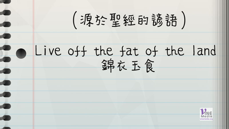 Live off the fat of the land是聖經創世記四十五章18節所用的詞句。可以享受地土肥美的出產,而fat除了解作肥美之外,也可以指肥膏、脂油、骨中的髓,即最好的部份。肥美的出產包括穀物、果子、菜蔬、牲畜(牛、驢、羊等)。因為土地肥沃,出產甚豐,不單可以養活住在其上的人口,更可養活無數的牲口。這句諺語現解作錦衣玉食,即享受地上的美物,包括佳餚美酒,肥甘,表示享盡榮華富貴,奢侈的生活,不愁衣食等等。