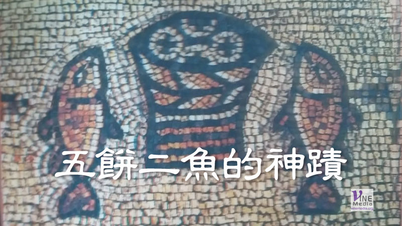 耶穌叫他們把五個餅兩條魚拿給祂,然後吩附眾人坐在草地上。祂拿著這五個餅兩條魚,望著天祝福,擘開餠,遞給門徒,門徒又遞給眾人。他們吃,吃飽之後把剩下的零碎收拾起來,裝滿了十二個籃子。