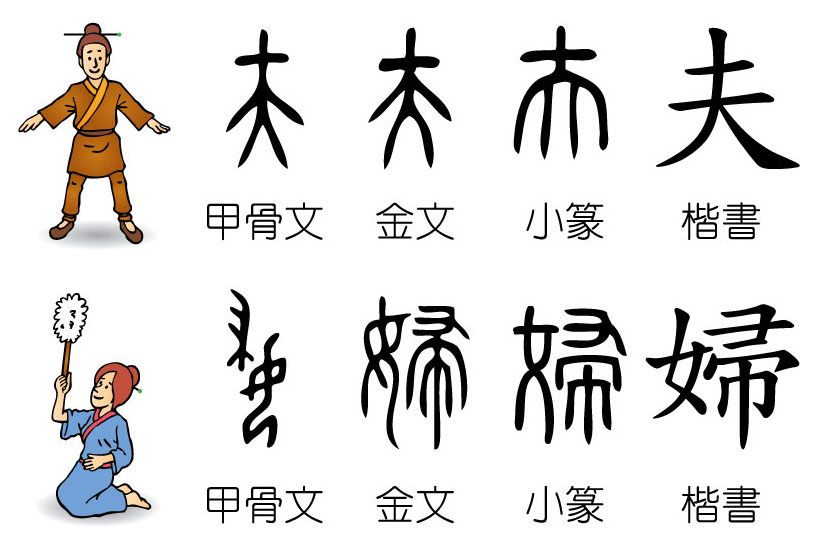 《說文解字》解釋「夫」:「夫:從大,從一,大象人形,一象簪形,男至二十而束髮,加冠以示成人,故其本義作『丈夫』解,乃成年男子之稱。」原來古時男子長大了,在頭髮上橫插一枝簪子就成了「夫」;但是我看「夫」為「二人」,男子可承擔自己和妻子的責任,他才是真正的男人。