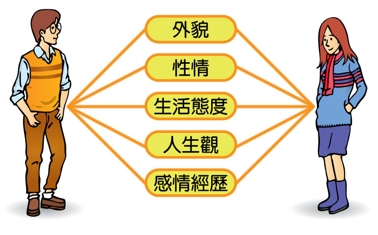 你是如何被她所吸引呢?原來人類選擇伴侶受五個基本元素影響: 男女普遍首先被異性的外表所吸引,繼而因為對方獨特的性情而展開追求;進深一步,是個人的生命素質,例如生活態度、人生觀和感情經歷,都是選定終身配偶的重要因素。 她是擁有甚麼素質才牽引你的朝思暮想呢?不要忘記那種由她而引發的「心動」感覺,請你珍惜這份純潔的愛。知己知彼,請你回想,你是用甚麼特質來吸引她的垂青?若然連自己也想不出因由,今晚就不妨問問她吧!