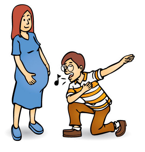 準爸爸一定要試試向著太太的肚皮唱歌,這是一個新鮮刺激的體驗;太太的肚子活像一個巨型的麥克風,你可乘機向她大唱溫柔的情歌,感謝她十月懷胎為你生孩子哩!