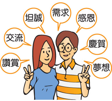 七種溝通方法能鞏固你們的婚姻: 讚賞:讓她感到受欣賞,慶幸有一個懂得欣賞妻子的丈夫; 交流:適當地增加彼此做事的透明度,能減少不必要的誤會; 坦誠:不要作無謂的假設,也不要刻意隱瞞事情,有疑慮時,應坦誠分訴; 需求:正面提出對配偶的要求,凡事有商有量; 感恩:一同為各種事情感恩,使心靈滿足而健康; 慶賀:分享彼此的成就和生活的喜樂; 夢想:一同編織夢想,讓夫妻更了解對方心底的期盼,齊心協力邁向更美的生命目標。 溝通減少兩性的隔膜,讓夫婦踏進水乳交融的門檻。