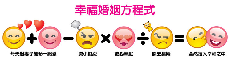婚姻裡的加減乘除每天對妻子加多一點愛、減少抱怨、誠心奉獻、除去猜疑,全然投入幸福之中。以上是幸福婚姻的方程式,除此之外,不要計算太多了。 婚姻裡的標點符號婚姻不是愛情的句號,它是一個開引號,讓夫婦兩人攜手填上情深的說話、共負一軛的經歷和至死不渝的故事。倘若婚姻以外,還有零星落索的煙花,請你毫不猶豫地把句號寫上;否則美滿的婚姻只會結束於感嘆號。