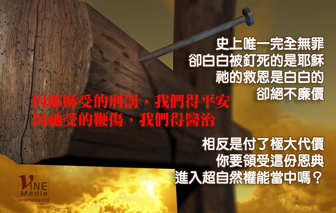 天父爸爸: 謝謝祢毫不保留的,差你的愛子耶穌來到世上為我而死;謝謝耶穌,因祢的順服及白白的犠牲,承受了我該承受的刑罰──罪的刑罰 ──使我白白的因信領受了這份莫大的恩典,叫我得以承受那創世以來為我所預備的國。耶穌,祢所受的刑罰、鞭傷已經受了,我理當憑信心領受這份因「成了」而帶來的平安與醫治!我的心啊,你當奉主基督耶穌的名宣告:因耶穌的刑罰,我有平安;因祂的鞭傷,我已得醫治。因信,我是站在豐盛的恩典中,人都要稱我為福的,因我是屬祂的! 謝謝主,奉主耶穌基督的名,阿們!