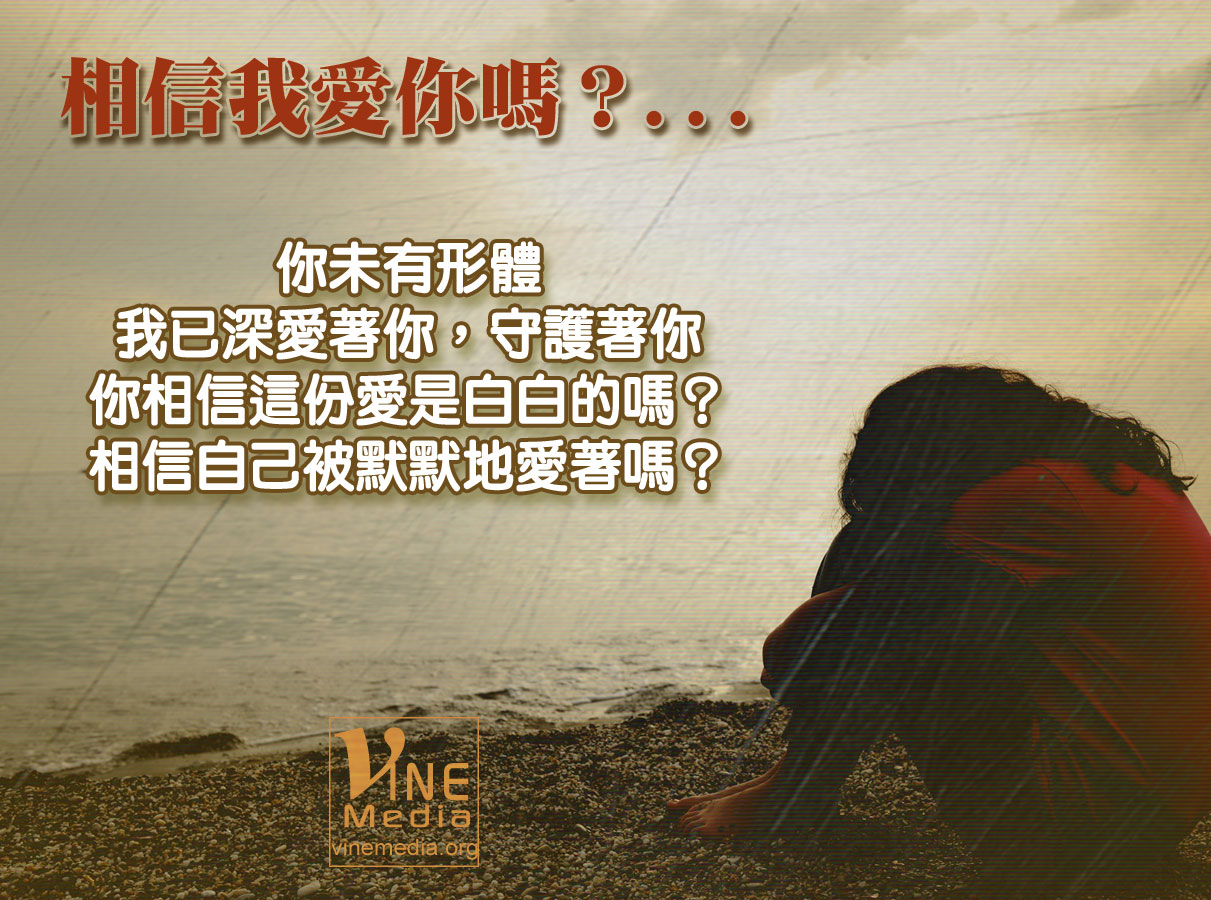 天父爸爸: 我不明白,在我未有形體之時,祢已默然愛我,這是什麼樣的愛?求祢把祢愛我的心,放在我裡面;把祢守護我的眼目,放在我眼中,好讓我能實實在在地感受到祢那無條件的愛!我相信這愛之深,我終其一生也不能猜透;這愛之高,任憑我再努力,也無法超越祢愛我的愛來愛祢;這愛之廣,世上無任何事能攔阻祢來愛我!我的父、我的神、我的主、我的王啊!我要安息在祢的懷中,傾聽祢聲音、仰望祢恩容!活著有祢就滿足了!謝謝祢!我愛祢!奉主耶稣基督的名,阿們!