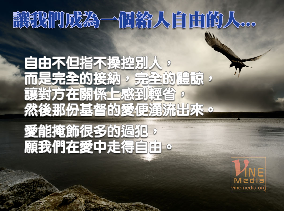 為著我在情感上、行動上操控人、不信任人的事,求祢原諒!原諒我只看到別人眼中的刺,而沒看見自己眼中的梁木!原諒我不懂得愛,因為原來我裡面也沒有愛!所以,我的主啊,求祢先用祢的愛來澆灌我、充滿我,讓我先被祢的愛來醫治、先享受在祢裡面的自由,我就懂得何謂愛。主啊,謝謝祢對我那豐富的恩慈、寬容及忍耐!祢沒有按我的罪過待我、也沒有照我的罪孽報應我。東離西有多遠、祢叫我的過犯、離我也有多遠。是的,所以我能奉主名宣告,我是輕省的、我是自由的!祢怎麼愛我,我對人也要有多一點恩慈、多一點寬容、多一點忍耐,以及多一點的愛。謝謝祢,奉主耶穌基督的名,阿們。