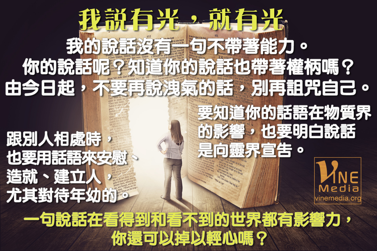天父爸爸: 謝謝祢,我的被造是奇妙的,因我擁有祢那份完美的形象,祢看我甚為美好!求祢幫助我能口出恩言,不在話語上咒詛人、咒詛自己!過去我若在話語上,得罪人、得罪神的,求父赦免,也求耶穌基督的寶血潔淨我,使我不再活在過去那不榮耀神的日子。我奉主耶穌基督的名宣告,我必起來,用禱告戰勝仇敵,不叫我在口舌話語上,給魔鬼留地步,使主的靈擔憂!我也奉主耶穌基督的名向靈界宣告,我要向耶和華歌唱,因祂大大戰勝,祂是我的神、我的幫助、我的高臺,我必能在話語上把一切的榮耀歸主!奉主耶穌基督的名,阿們!