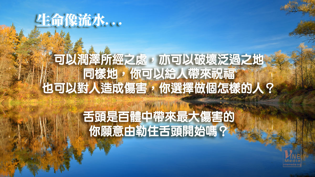 我是嘴唇不潔的人,因我心裡所充滿的,口裡就說出來,求祢赦免,為我造清潔的心,也幫助我快快的聽、慢慢的說、慢慢的動怒,叫我不以口犯罪,以致我得罪祢;興起我的生命,扶助軟弱的、堅固那將要衰微的,叫我的禱告在祢面前沒有阻礙!主啊,活水的泉源在祢,賜我力量竭力選擇祢的道,在祢道上直奔。一個泉眼不能發出甜苦兩樣的水、頌讚和咒詛也不能從一個口裡出來,幫助我只說祝福的話、單要祝福,至於污穢的言語,一句不可出口,只要隨事說造就人的好話,叫聽見的人得益處,因這祝福終究要回到我的生命裡,成為我一生至大的福氣!謝謝主,奉主耶穌基督的名,阿們!
