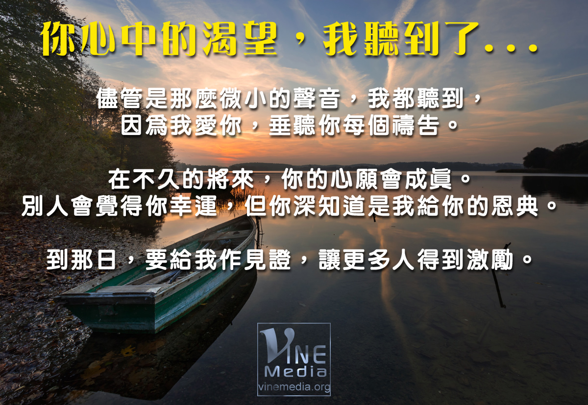 祢每個孩子的禱告,祢誠然聽見了!願祢將一個剛強壯膽的心,賜給每一個祢所愛的孩子們,叫他們不至喪氣。也願祢叫我們懂得怎麼數算祢給我們的恩典,不叫我們失去盼望!幫助我們得以繼續昂首、高過四面的仇敵.並要歡然獻祭、唱詩、歌頌神。謝謝主!奉主耶穌基督的名,阿們!
