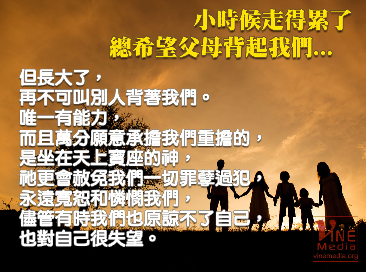 天父爸爸: 天天背負我們重擔的主,就是拯救我們的 神,是應當稱頌的!我們縱然失信,祢仍是可信的.因為祢不能背乎自己。謝謝主,因 神的應許、不論有多少、在基督都是是的,阿們。主啊!讓我一心信靠祢,永不後退,我若將可誇的盼望和膽量,堅持到底,便是祢的家了。祢的靈也住在我的裡面,叫我知道,我只管坦然無懼的,來到施恩的寶座前,為要得憐恤、蒙恩惠作隨時的幫助。謝謝祢賜給我的一切恩惠,也謝謝祢按著我的本相來愛我,並且祢已赦免了我,我也要原諒我自己,好叫我的喜樂滿足。謝謝祢,奉主耶穌基督的名,阿們。