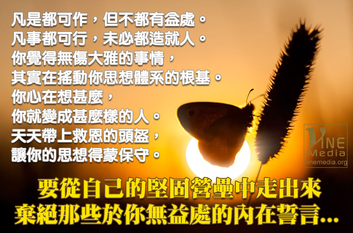 天父爸爸: 保守我所思、所想的,使我愛慕那純淨的話語。也賜我一顆願意的心,選擇上好的福份,謹慎分辨我所聽、所說的每一句話,因為心裡所充滿的,口就說出來。甚願我遵守祢的命令、典章,因為祢的話、就是靈、就是生命,是於我有益的。我奉主耶穌基督的名宣告得勝,我在各樣的事上,靠著愛我的主,表明自己是屬主的,我就能在一切的事上,得勝有餘了。我的靈啊!你要靠主剛強壯膽,因為知道祂必使軟弱的手堅壯、無力的膝穩固。謝謝主,奉主耶穌基督的名,阿們。