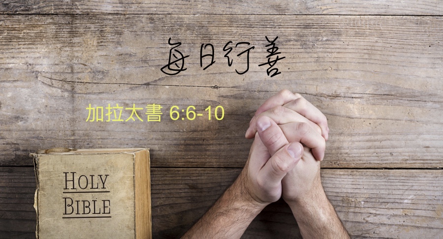 更加具體的是,主提醒我們要把握機會去行善,正如經文第十節所說的,假如我們一有機會,便要把握這機會向眾人行善。今天,從你起床這一刻開始,你行過什麽善事呢?也許是對親人的微笑、對朋友的關懷… 我們有沒有如同聖經所說的,一有機會就把握地去到向眾人行善呢?如果到現在你還沒有想起今天行了什麽善事的話,不要緊,讓我們去禱告:「主,接下來我將要面對一個的對象,到這一刻我還不知道他是誰,就讓我向他行善,下一個你將要讓我遇到的人,就使我把握這個機會順著聖靈去撒種,向他一個微笑或關懷,求主幫助。」