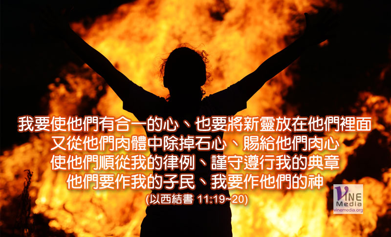 我要使他們有合一的心、也要將新靈放在他們裡面、又從他們肉體中除掉石心、賜給他們肉心。使他們順從我的律例、謹守遵行我的典章.他們要作我的子民、我要作他們的神。 (以西結書 11:19~20)