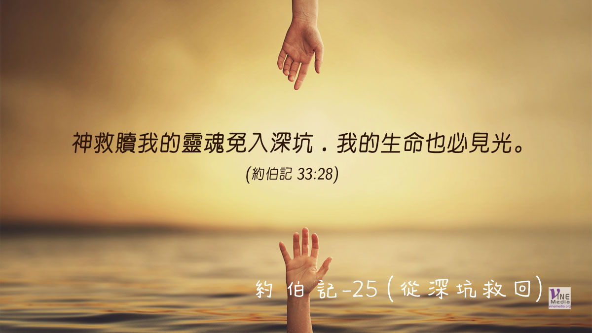 「為要從深坑救回人的靈魂、使他被光照耀與活人一樣」(30節)──「日後你遭遇一切患難的時候、你必歸回耶和華你的 神、聽從他的話。」(申 4:30)