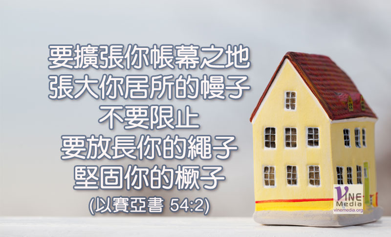 要擴張你帳幕之地、張大你居所的幔子、不要限止、要放長你的繩子、堅固你的橛子。(以賽亞書 54:2)