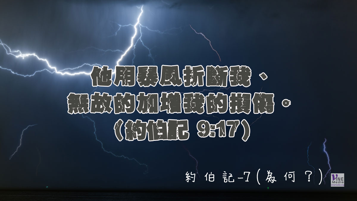 「他用暴風折斷我、無故的加增我的損傷」──這是約伯從頭到尾,一個徹底深信神無故加增他的苦楚,在他看來善惡、完全人、惡人都一樣被神滅絕。