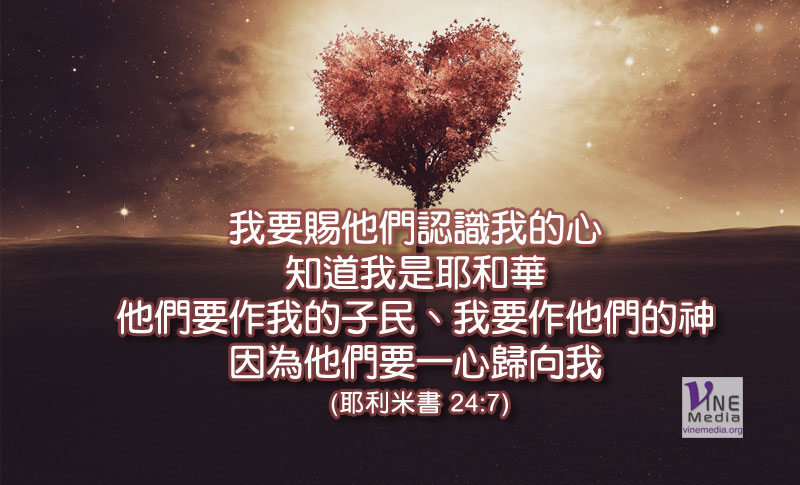 我要賜他們認識我的心、知道我是耶和華.他們要作我的子民、我要作他們的神、因為他們要一心歸向我。 (耶利米書 24:7)