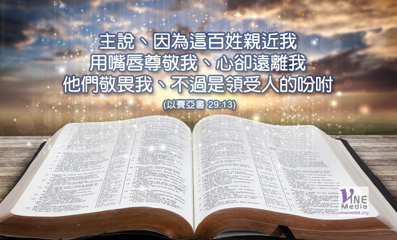 主說、因為這百姓親近我、用嘴唇尊敬我、心卻遠離我.他們敬畏我、不過是領受人的吩咐。 (以賽亞書 29:13)