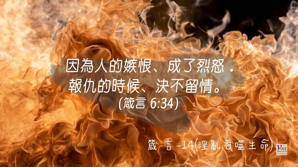 因著男人/女人在彼此的關係中不聖潔,所引發出嫉恨的烈怒,是如火著起,正如神是忌邪的神──「耶和華是忌邪施報的 神.耶和華施報大有忿怒.向他的敵人施報、向他的仇敵懷怒。」(鴻1:2)──這個「嫉恨」,是會「成了烈怒」,甚或使人動了「殺念」,如同神「看不中該隱和他的供物.該隱就大大的發怒、變了臉色⋯⋯該隱起來打他兄弟亞伯、把他殺了。」(創4:5,8)