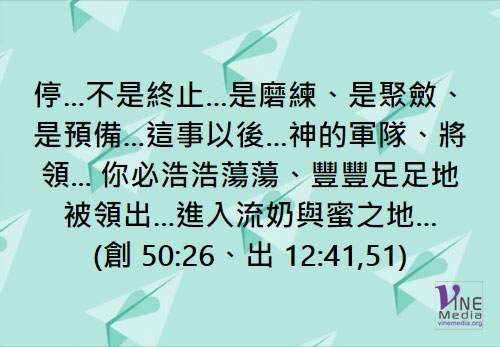 你若在困境中的話,記得,那只是「暫時的停留」,要記得,你被揀選不是你有什麼比別人強的地方,只因你認識祂,你就是屬祂的,是祂的軍隊!祂終必親自按你的名字召你,帶你「從埃及地領出來」、從為奴之地、從困苦之地、從憂傷中、從絕望中領出!這只是磨練、預備你的過程!記得,終必過去的!流奶與蜜之地在前方!