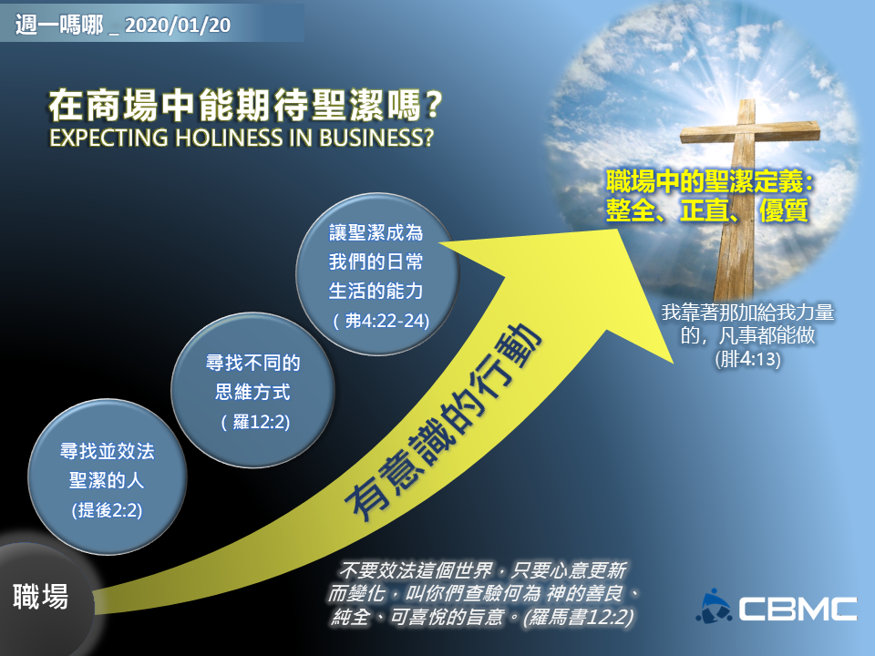 字典把這個詞定義為「聖潔的品質或狀態」,同義詞包括:蒙福、屬神、虔誠、敬畏、神聖…等等。這些字似乎都與商場無關,至少是與21世紀的商場無關。然而,我最近聽到一位講者解釋「聖潔」的字根,其實意謂著「整全」、「正直」和「優質」。